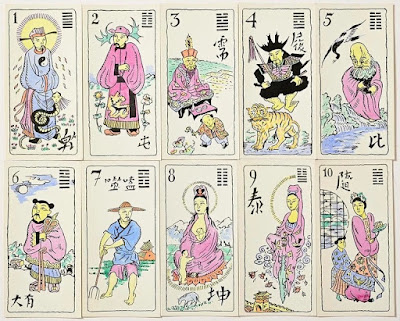 In 1954 Basil Ivan Rakoczi wrote his book «The Painted Caravan», in which he presents a rather romanticed and fanciful view of the gypsies and tarot. It is a good read, even though one will find there little solid material, but instead a nicely woven account that will still appeal to some people. The book is rescued from oblivion, as with Benavides’ work, by some original tarot illustrations. These are primarily a reworking by Rakoczi of the Tarot of Marseilles images, but with some additions and modifications. A few are shown in colour and the endpapers of the book show some paintings based on tarot designs. Rakoczi includes designs for a full 78 card deck. His book is expensive but well worth buying for the tarot images, even if his text today seems too rhetorical and presents a too romanticed and fantastical image of gypsies and their involvement with tarot.